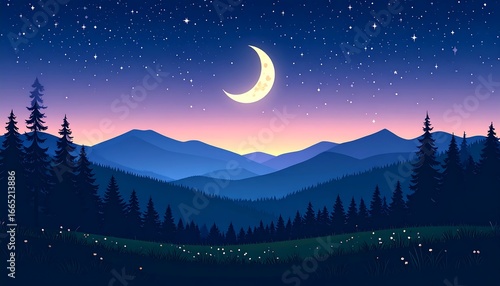 © Kemol, Fototapeta premium Night mountains with crescent moon, and stars.