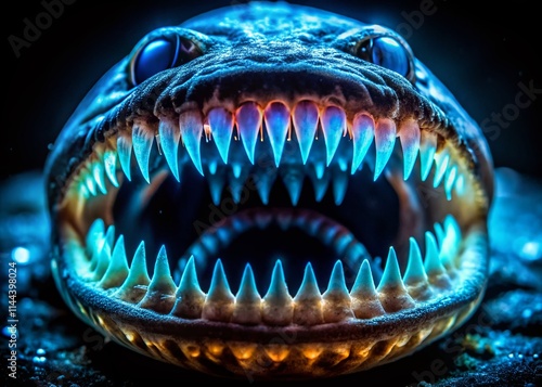 Fototapeta premium Night Ocean Fish Teeth: Bioluminescent Deep Sea Predator Jaws, Underwater Macro Photography, Dark Aquatic Life