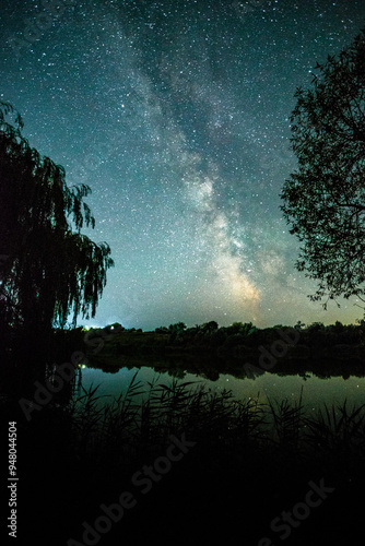 © Aleksandr Riabinin, Fototapeta premium Night on the lake with beautiful night sky . Milky Way over the lake . Sky with stars , landscape in the night