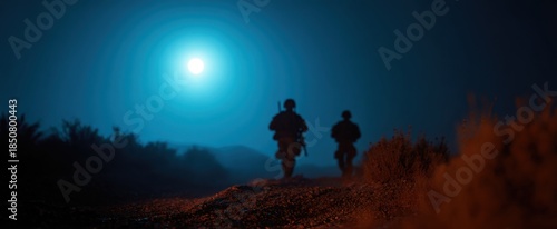 © ckybe, Naklejka premium Night operation training with soldiers stealthily advancing across rugged and shadowy terrain