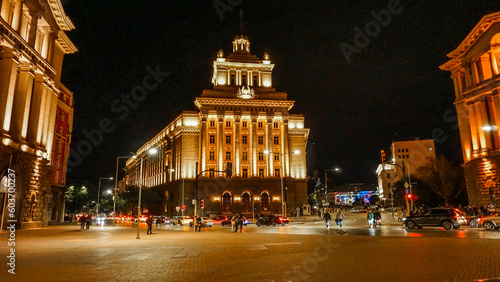 © Rosen, Fototapeta premium Night panorama of Independence Square and the Former Party House, Sofia, Bulgaria.