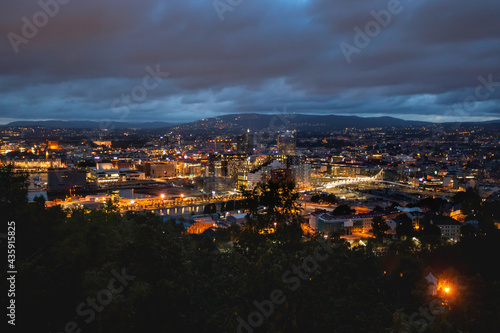 Obraz premium Night panoramic view of Oslo, capital of Norway. Dark cloudscape ower capital of Norway. Scandinavian city with lighted buildings and bridges, surrounded by forests.