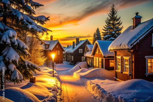 © DigitalArt Max, Fototapeta premium Night photography captures a snowy village's enchanting silhouette, a winter wonderland of charming homes.