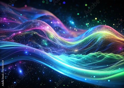 © prapatsorn, Fototapeta premium Night Photography: 3D Rendered Vibrant Particle Waves, Abstract Energy Flow, Glowing Nebula, Cosmic Dust, Sci-Fi Background