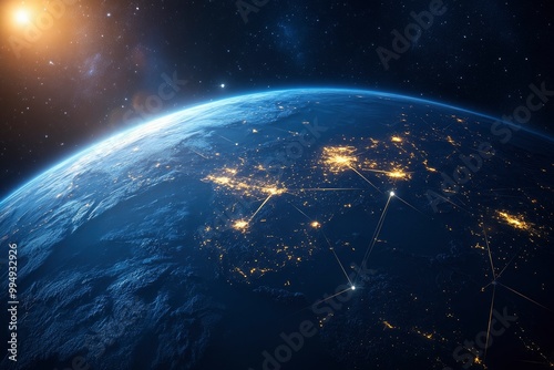 © Fathor, Fototapeta premium Night planet earth from space with light lines of communication and connection. Business and finance, concept. Global communications system and the World Wide Web. generative ai
