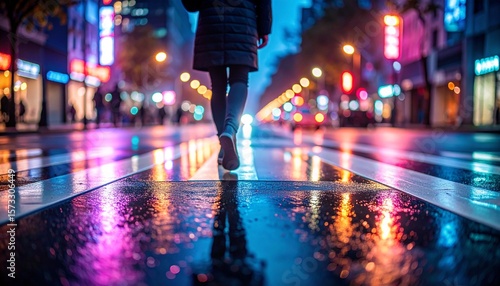 © Meta Hemwipat, Fototapeta premium Night Reflections: A person strolls down a rain-slicked street at night, neon lights casting vibrant reflections on the wet surface.