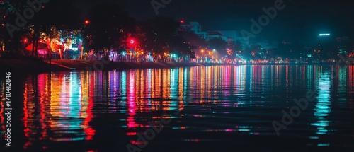 Obraz premium Night reflections glow on a city lake, colors dance on the water surface.