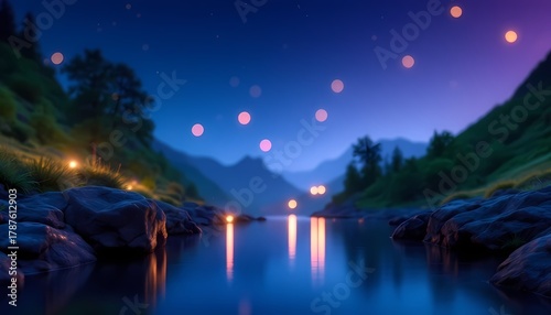 © Marc Kunze, Obraz premium Night river landscape with glowing lights and mountain reflections