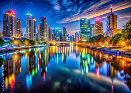 Naklejka premium Night River Scene: Deep Depth of Field Cityscape Reflections