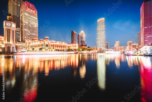 © H stock, Naklejka premium Night scene cityscape of Tianjin ferris wheel,Tianjin eyes in twilight time.Most Modern and popular landmark in Tianjin city.