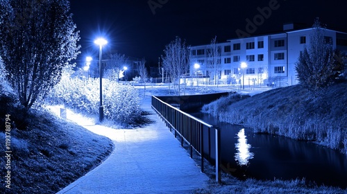 © RABBI, Obraz premium Night Scene, Illuminated Pathway Beside Canal, Modern Building