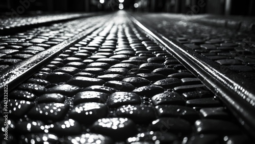 © AIArtistry, Obraz premium Night Scene of a Wet Cobble Tramway Illuminated, in Grayscale