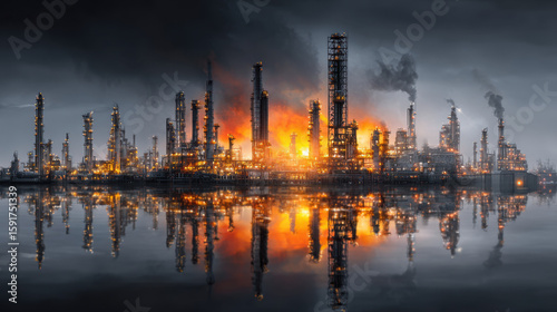 © Suppawith, Fototapeta premium Night Scene of an Industrial Cityscape with Fire and Smoke Reflections