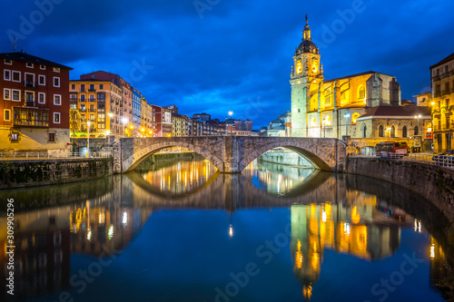 © jon_chica, Naklejka premium night scene of bilbao old town, Spain