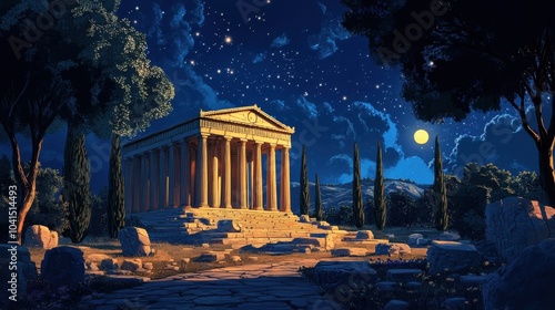 Fototapeta premium Night scene of Greek temple illuminated by soft lights casting shadows with a...