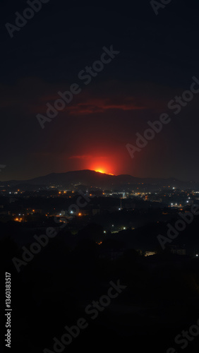 Naklejka premium Night scene with a bright red wildfire raging on a hillside above a city.