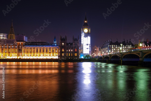 © Pealiku, Naklejka premium Night scene with light trails on the Westminster bridge. Big Ben and House of Parliament in London, The United Kingdom of Great Britain.