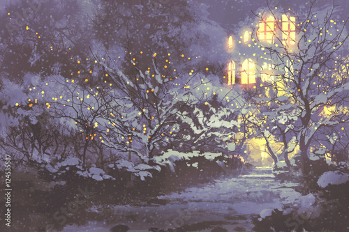 Obraz premium night scenery of snowy winter alley in the park with christmas lights on trees,illustration painting