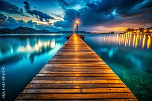 © Danicha, Fototapeta premium Night Sea Dock, Illuminated Pier, Waterfront at Night, Dark Ocean, Empty Harbor