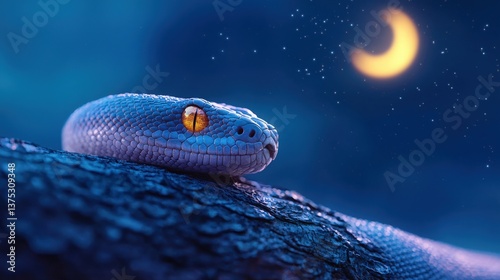 Fototapeta premium Night Serpent, Blue snake at night under crescent moon