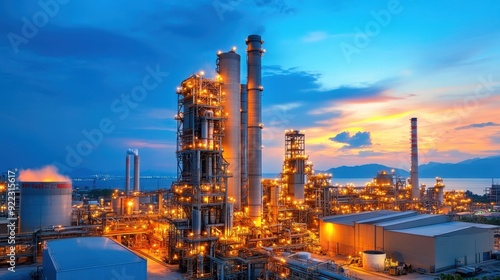 Fototapeta premium Night shift at a cement plant, workers and machinery operating under artificial lighting
