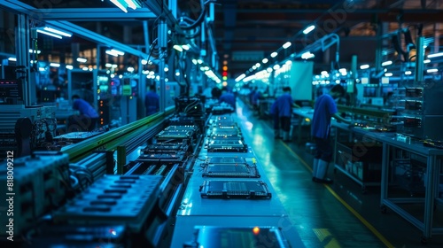 Naklejka premium Night shift at an electronics assembly line, soft blue and green lighting illuminates workers and machines creating an array of devices