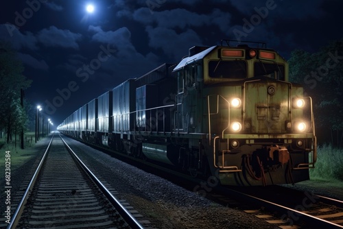 Fototapeta premium night shot of a cargo train with illuminated cabins