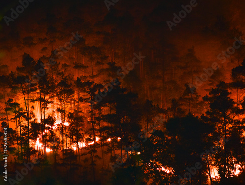 © HB, Obraz premium Night shot of a fierce forest fire engulfing trees on a hillside in Meghalaya.