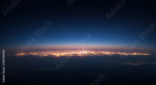 © Satriyo, Fototapeta premium Night Sky Aerial View of Illuminated City Skyline Above the Clouds