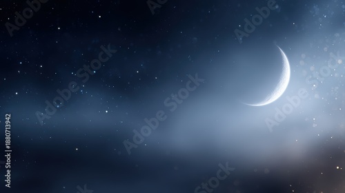 Fototapeta premium Night sky background with glowing crescent moon and scattered stars, peaceful Ramadan mood,