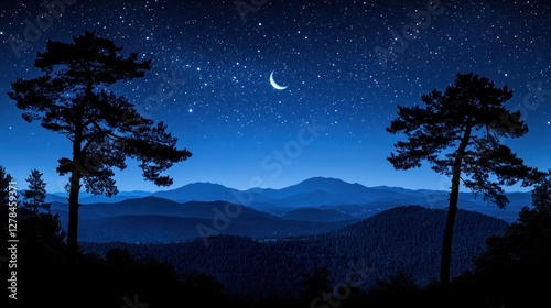 © Lemdah, Naklejka premium Night sky, crescent moon, mountain silhouettes, pine trees, landscape
