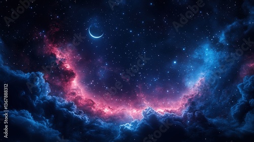 Obraz premium Night sky, crescent moon, nebula clouds, starry background, cosmic backdrop