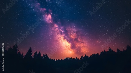 Fototapeta premium Night sky featuring the vibrant Milky Way galaxy and pine forest silhouette, starry cosmos with colorful nebula, creating a mystical atmosphere in high-resolution astrophotography.