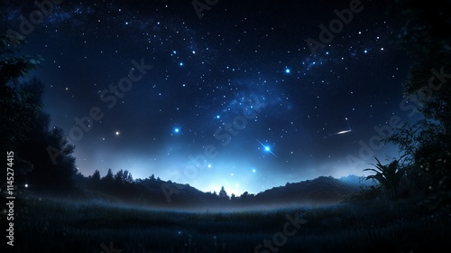© fotofabrika, Naklejka premium Night sky filled with stars over a tranquil forest landscape at twilight