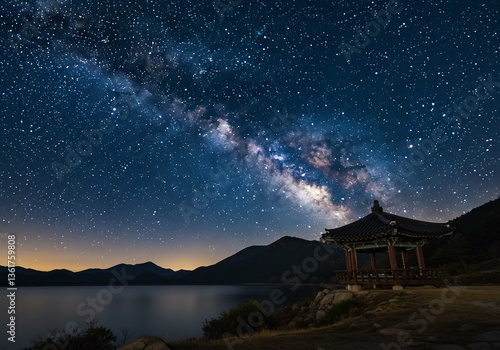 © NguyenHaiPhuong, Fototapeta premium Night sky Milky Way over tranquil lake and pavilion. AI Generated