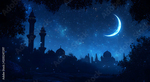 © Gustav, Fototapeta premium Night Sky Mosque Serenity: Starlit Crescent Moon over Majestic Silhouette