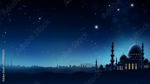 Naklejka premium Night Sky Mosque Silhouette with City Skyline and Stars