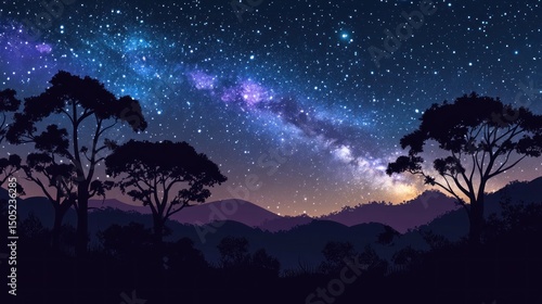 © Nandar, Naklejka premium Night Sky Over Silhouetted Trees and Mountains