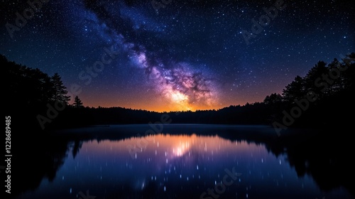 Naklejka premium Night Sky Over Tranquil Lake with Starry Reflection