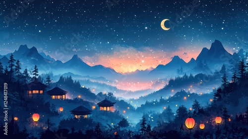 © Factory Stock, Fototapeta premium Night Sky Serenity: Mountaintop Haven with Glowing Lanterns