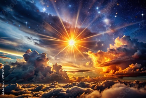 © Adisorn, Naklejka premium Night Sky Weather Word Cloud Sunburst Dramatic Cloudscape Photography