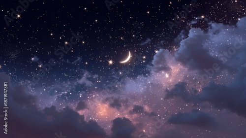 Fototapeta premium Night sky with crescent moon and stars among clouds.