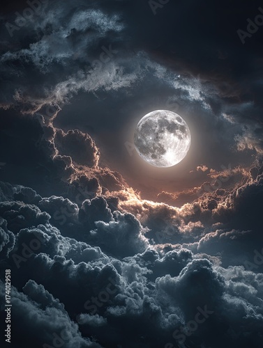 © Alexander LW, Obraz premium Night sky with full moon in clouds. huge moon in the sky