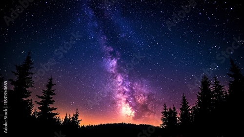 © larrym, Naklejka premium Night sky with milky way visible above trees and horizon glow.