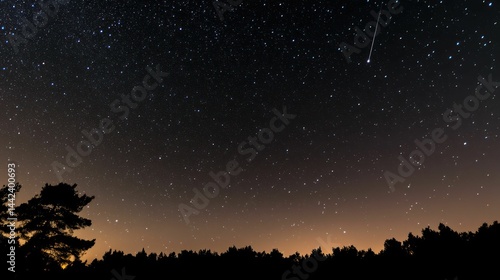 Naklejka premium Night sky with shooting star over a silhouetted forest landscape