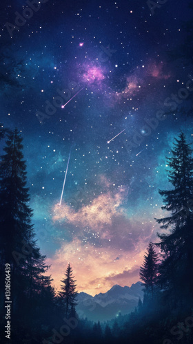 © 王二小, Naklejka premium Night sky with shooting stars over a forest