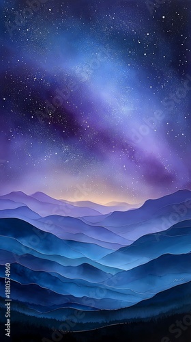© ahmad, Fototapeta premium Night Sky with Stars Over Blue Mountain Range Digital Artwork
