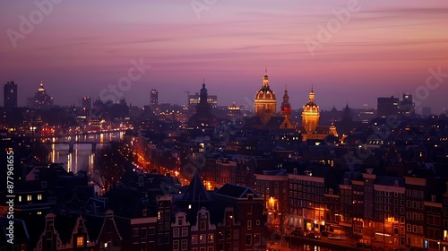 © Bonnie, Obraz premium Night skyline historical center of Amsterdam