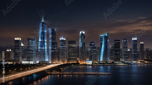 © Afaq Bashir, Naklejka premium Night Skyline of Futuristic Cityscape with Modern Skyscrapers