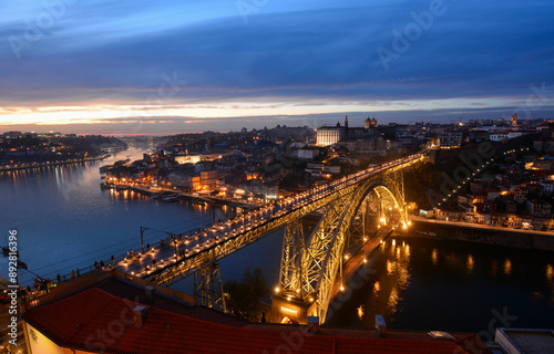 Obraz premium Night skyline of Porto, Portugal, with the Dom Luis I Bridge, a metal arch...